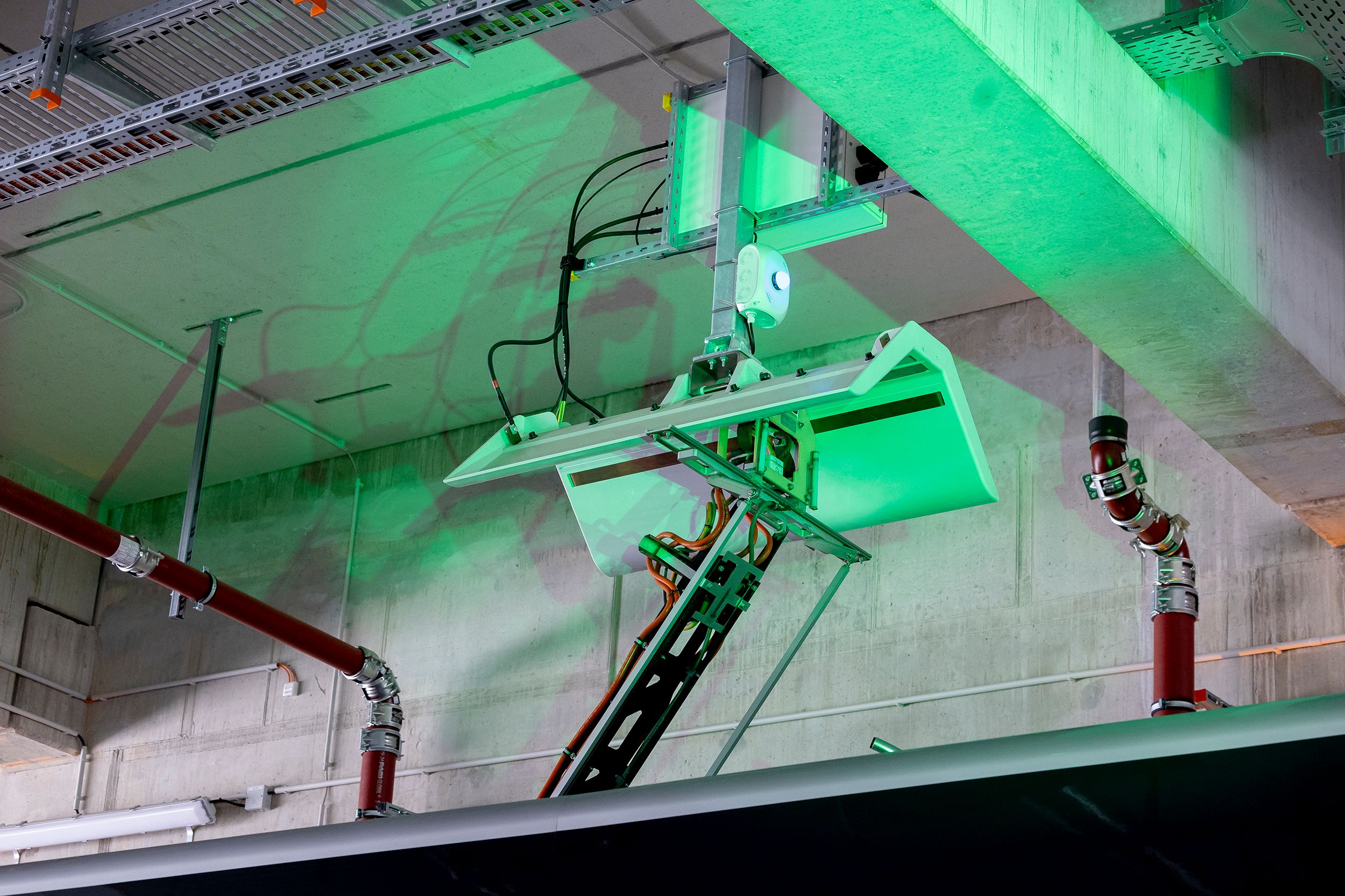 Im September 2025 eröffnete die Rheinbahn auf ihrem Betriebshof in Düsseldorf-Heerdt einen E‑Bus‑Port, eine Anlage, die weit mehr ist als eine Garage. Auf 5.500 Quadratmetern entstanden zwei Abstellhallen, eine Wartungshalle und darüber ein Technikgeschoss mit Transformatoren, Lade‑ und Gebäudesteuerung. Das Dach ist begrünt und trägt 501 Solarmodule. Diese erzeugen jährlich rund 195 Megawattstunden grünen Strom und sparen rund 66 Tonnen CO₂ ein. Die Anlage ersetzt eine durch den Brand im Jahr 2021 zerstörte Halle. Die Planung dauerte 18 Monate, die Bauphase zwei Jahre – und sie musste bei laufendem Betrieb mit engen Platzverhältnissen bewältigt werden. Und als wäre das nicht schon Herausforderung genug, stieß das Projektteam beim Bau auf Rückstände des Löschschaums vom Brand– eine Altlast, die aufwendig entsorgt werden musste. Über zehn Kilometer Kabel, drei Schnelllader mit jeweils 300 Kilowatt Leistung und ein intelligentes Lastmanagement versorgen heute 60 Ladepunkte mit insgesamt vier Megawatt Energie. Parkt ein Bus ein, fährt automatisch ein Pantograph aus dem Dach und dockt an die Ladehaube in der Decke des Bus-Ports an. „Mit dem neuen E‑Bus‑Port haben wir in Heerdt jetzt den ersten Betriebshof, der konsequent auf E‑Mobilität ausgelegt ist. Seine Fertigstellung ist ein Meilenstein auf dem Weg zu abgasfreier und leiser Mobilität“, erklärt die Rheinbahn-Vorständin. Die Mobilitätswende hat ihren Preis: Der Depot‑Neubau schlägt mit 24 Millionen Euro zu Buche, die zu 90 Prozent vom Land NRW über den Verkehrsverbund Rhein‑Ruhr gefördert werden. Ein Preis, der sich in sauberer Luft und leiser Mobilität auszahlen soll.