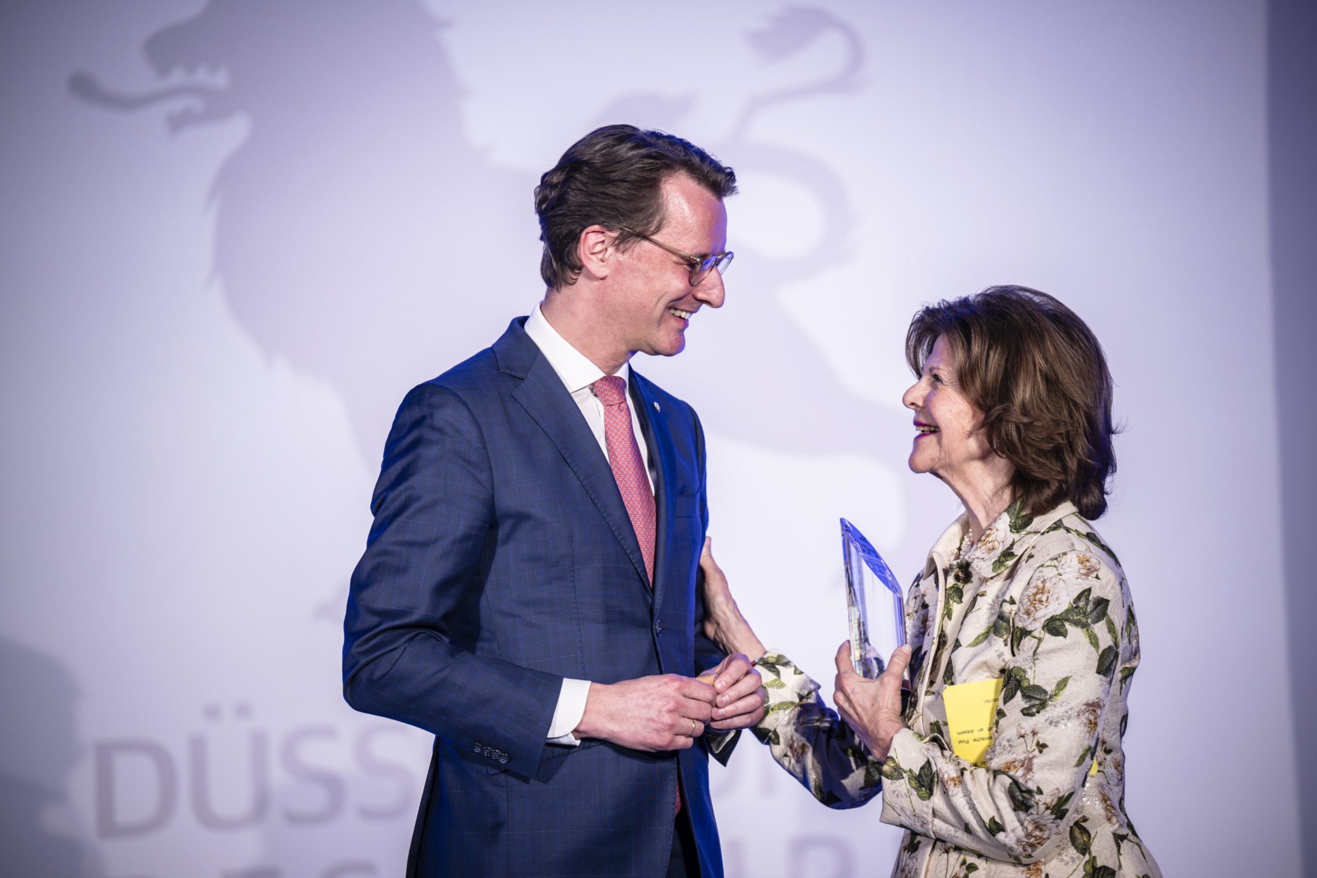 v.l.: NRW Ministerpräsident Hendrik Wüst überreichte Königin Silvia von Schweden die Auszeichnung „Düsseldorferin des Jahres“ für ihr Lebenswerk