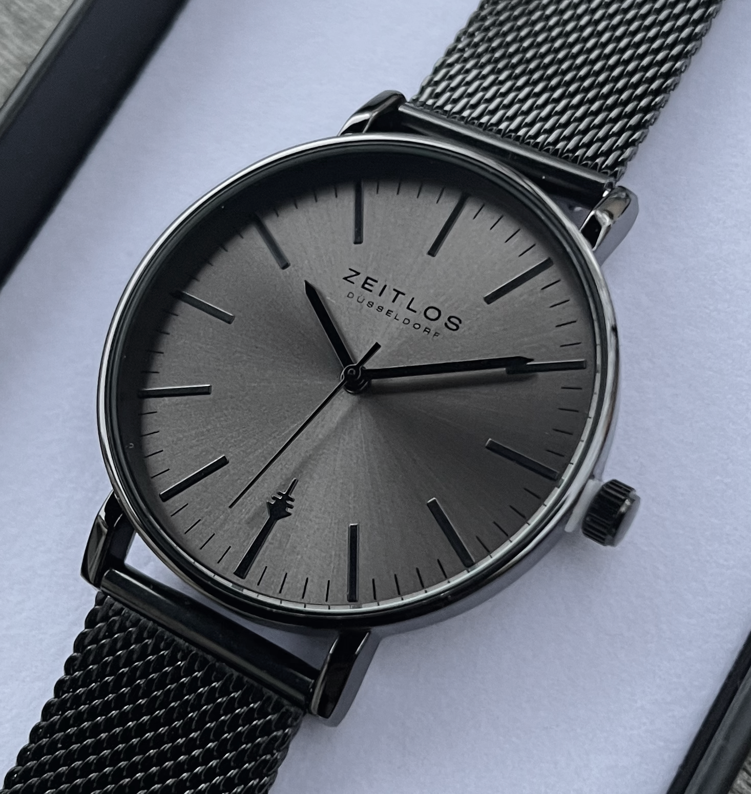 Düsseldorf hat eine Menge zu bieten: Die Kö, die längste Theke der Welt, den Rosenmontagszug – und last but not least auch eine Uhr mit dem Rheinturm auf der 6. Die trägt enkelson. schon länger. Der Gründer der Marke Zeitlos schickte enkelson. die Uhr, was naheliegt, denn schließlich wurde der Musiker mit „Düsseldorf (Mein Blumentopf)“ stadtbekannt. enkelson. wurde daraufhin zwar kein Marken-Influencer, dafür aber ein echter Fan der Uhr. „Klobige Uhren mag ich nicht. Die Zeitlos-Uhren sind sehr flach und schlicht.“ Und weil ihm die Marke und das Design so gut gefielen, und der Gründer neben Beruf und Nachwuchs unter seinem zweiten Standbein ächzte, übernahmen der Sänger und sein Bruder Pino Degiorgio kurzerhand 2024 die Marke.