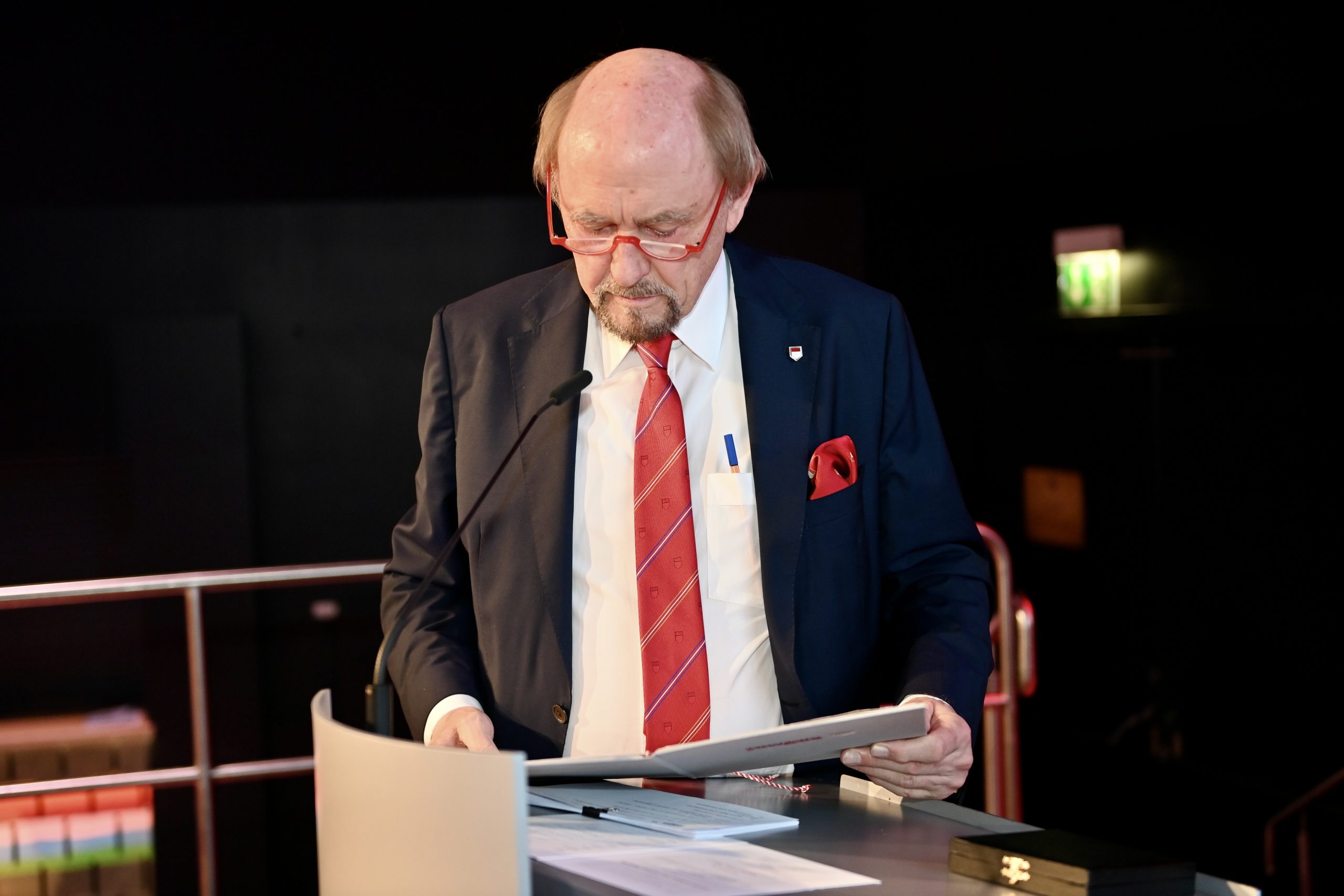 Dr. Reinhold Hahlhege, Baas der Düsseldorfer Jonges, verliest die Ehrenurkunde.
