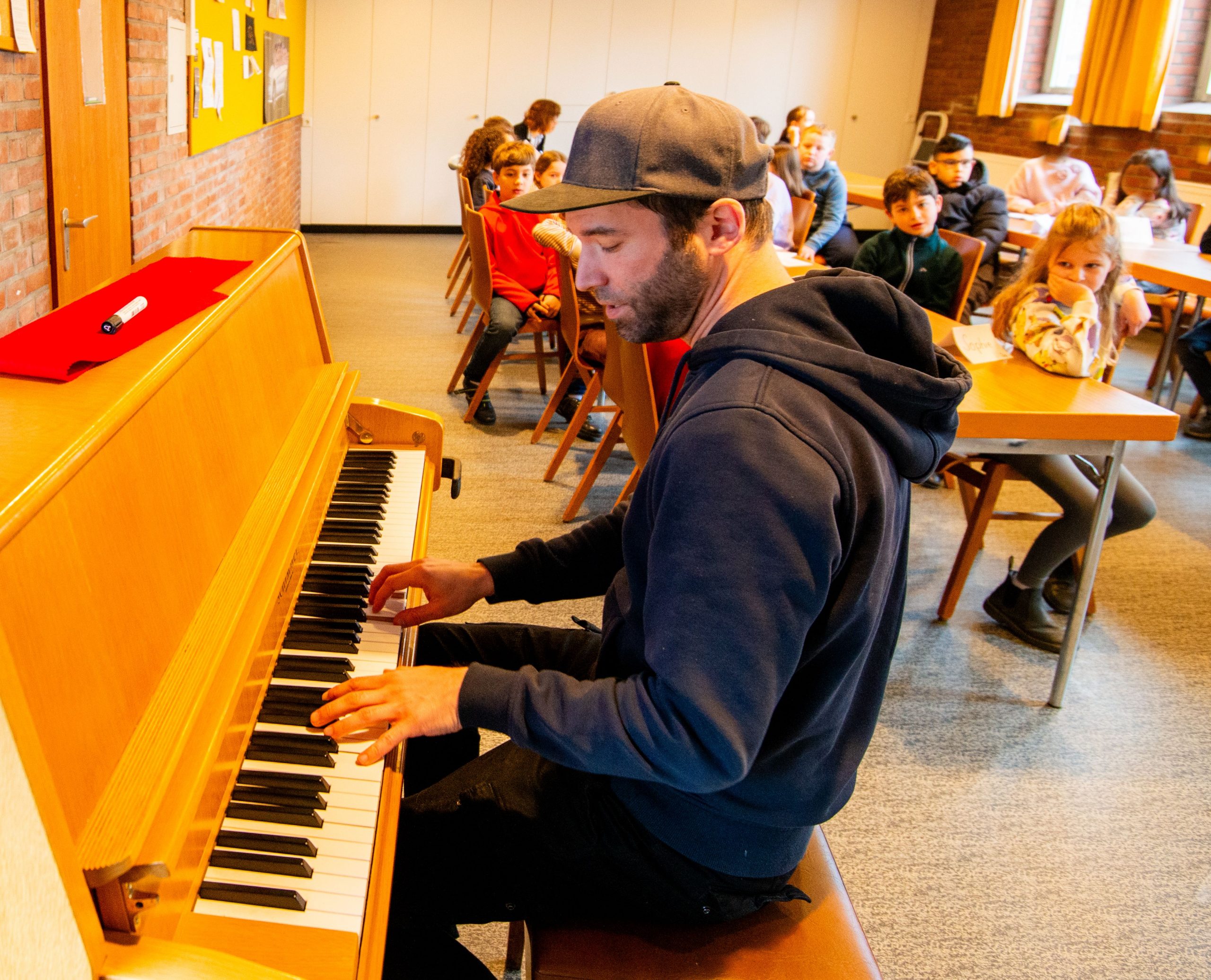 Doch noch ist er nicht fertig. Gerade ist die dritte von zehn Unterrichtsstunden und Enkelson und die dritte Klasse texten und singen zusammen. Enkelson erklärt den Kindern, woraus ein Song besteht und wie er durch einen eingängigen Refrain zum Ohrwurm wird. Und dieser Ohrwurm wird ganz besonders, weil Enkelson den Schulgong in seine Komposition mit aufnehmen wird – ebenso wie die Idee der Kinder, am Anfang des Songs eine Schuldurchsage zu machen. Am Ende des musikalischen Projektes erhalten die Schulen drei Versionen: eine mit den Kinderstimmen, eine mit Solo-Stimmen und eine Instrumentalversion für Auftritte und Schulfeste. „Und zwar lizenzfrei“, erklärt der Musiker.