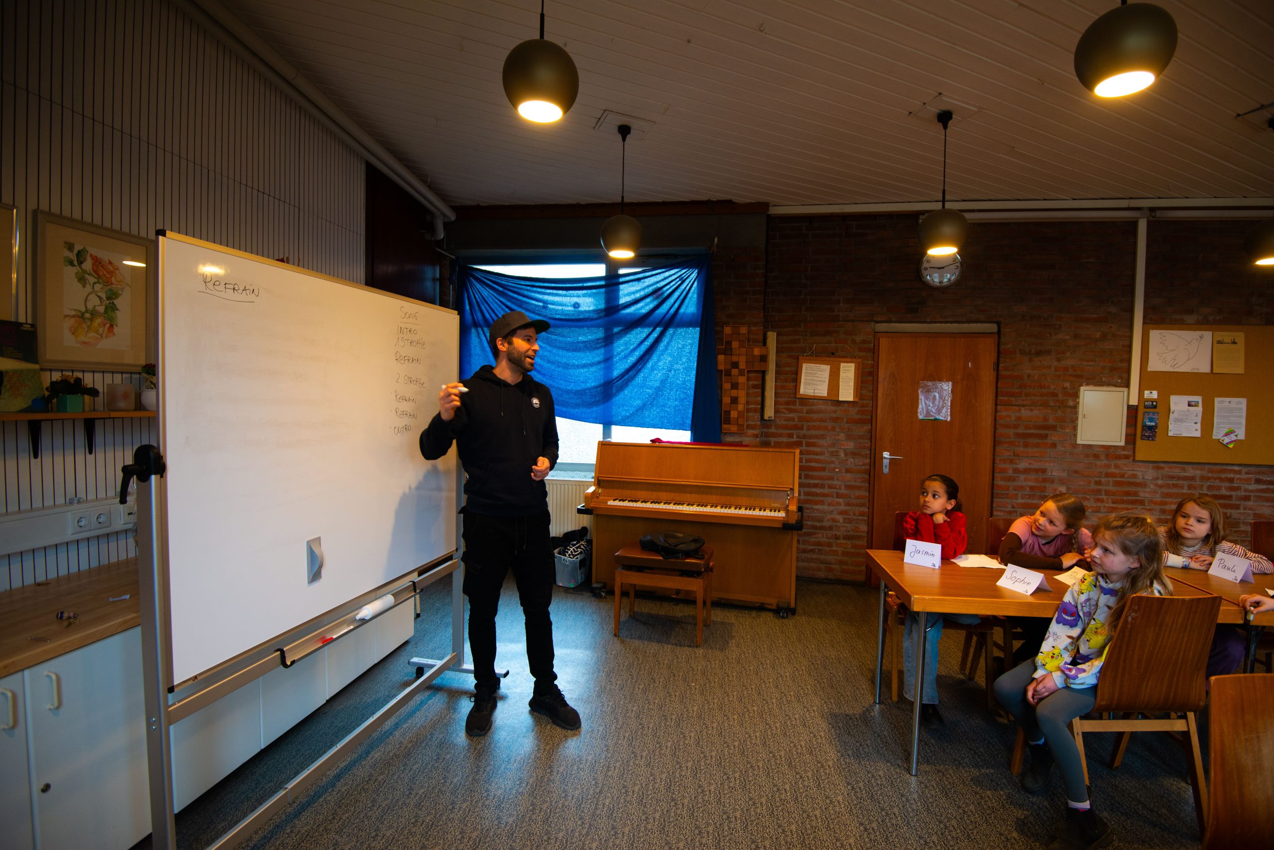 Was in den Song soll, darüber haben die Kinder klare Vorstellungen, schließlich kennen sie sich aus in der Pop-, Rockmusik, hören Wincent Weiss, die Rapper Apache 207 und Nina Chuba. Omar, neun Jahre alt: „Der Song soll cool sein.“ Lorelei, acht Jahre alt, weiß auch schon, was unbedingt rein muss: dass Lernen Spaß macht und die Lehrer nett sind. Aaron, neun Jahre alt, hat einen besonderen Wunsch: „Die Klassenfahrt sollte auch eingebaut werden.“ Teis, neun Jahre alt, hört sonst eigentlich Rock und schwört auf die Toten Hosen. Aber mitsingen will er trotzdem. Alexandra, acht Jahre alt, singt im Vorchor und denkt schon weiter: „Ich könnte den Song auch mal im Chor vorschlagen.“